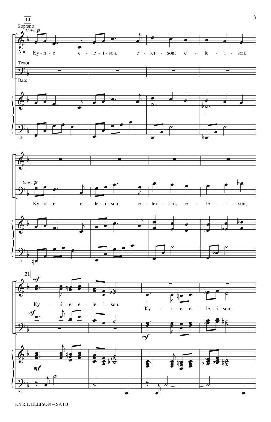 This lovely and expressive setting of the Kyrie with gently arching phrases and rich harmonic nuance will enhance concert programs and worship services for choirs from school through adult. Perform with keyboard or optional chamber orchestra. Available separately: SATB, SSA, Chamber Orchestra score and parts (fl 1-2, ob, cl 1-2, bn, perc 1-2, hp, vn 1-2, va, vc, db), ChoirTrax CD. Duration: ca. 3:00.