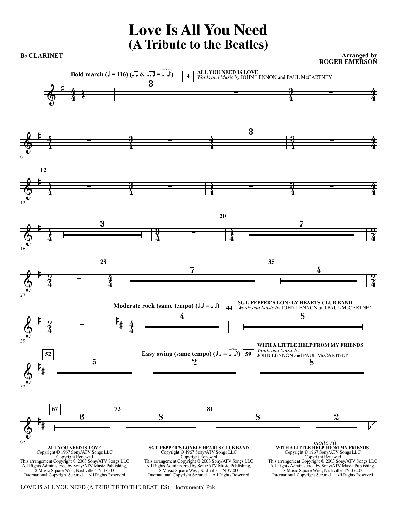 For three generations, singers and fans have enjoyed the music of the Beatles. This 17 minute feature medley is a salute to the music and the musicians who created the songs that make up the soundtrack of our lives. Includes Parts for: Bb clarinet, Bb trumpet 1 & 2, Tenor Sax, Trombone, Synthesizer 1 & 2, Rhythm Guitar, Lead Guitar, Drum Set and Percussion.