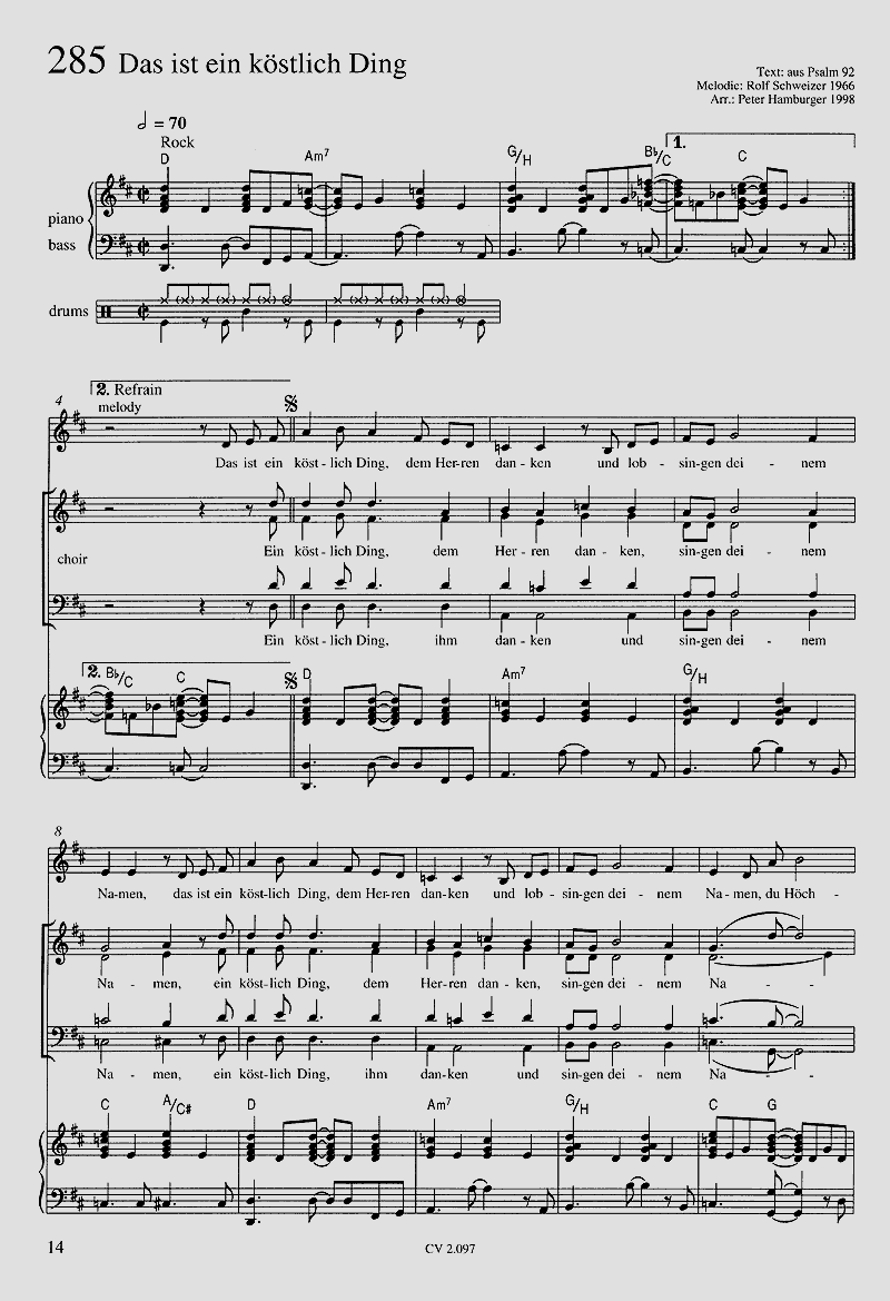 Pop-Arrangements für Kirchenchöre zum EG Chor 1-4 stg, in der Regel besetzt mit Piano, Bass, Drums, Trb und Instrumenten in C, Bb, Eb. 'Chöre, die neue Lieder des Evangelischen Gesangbuches im poppigen Stil singen möchten, sind hier richtig ... Es ist das erste Chorbuch dieser Art und soll dem Trend der Chöre hin zu Pop und Jazz Rechnung tragen. Die stilistische Bandbreite reicht von Swing über Pop und Rock bis hin zum Latin. Die Chorpartien sind leicht bis mittelschwer, farbige Sätze mit rhythmischem Pep bereichern die Lieder. ... Die Liste der Arrangeure bürgt für eine gute Qualität der Arrangements. Ein Chorbuch für all diejenigen, die einmal in die Welt des Swings und Pops schnuppern wollen.' (Musik im Bistum Essen I/2000)