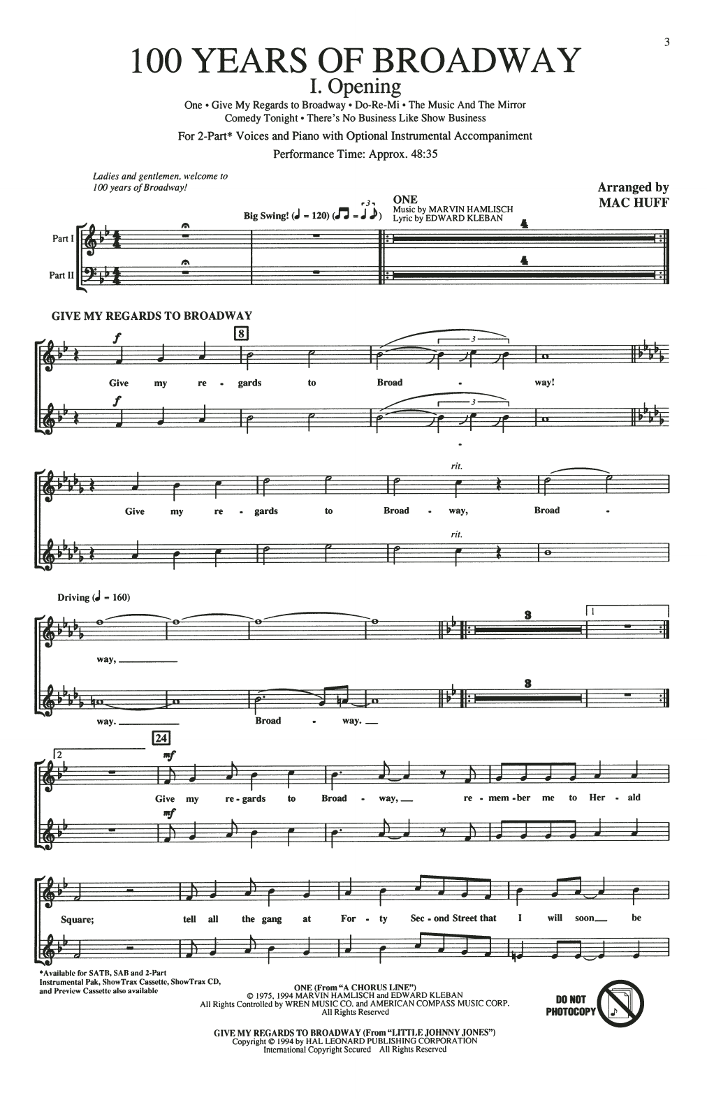 Celebrate the history of Broadway and our great heritage of musical theater in this marvelous choral medley by Mac Huff. From the music of Tin Pan Alley to state-of-the-art contemporary Broadway, you'll treasure the magic of an entire century of entertainment, laughter, and beautiful music! Available: SATB Director's Score, SAB Director's Score, 2-Part Director's Score, SATB Singer's Edition, SAB Singer's Edition, 2-Part Singer's Edition, Instrumental Pak, Preview CD, ShowTrax CD. Performance Time: Approx. 48:35.