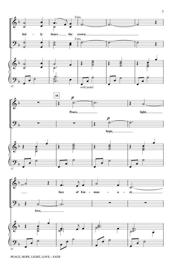 An original melody Peace, Hope, Light, Love is paired with the joyful English carol The Holly and the Ivy for a buoyant and festive seasonal treat! Your concert hall will resound with joy and your listeners' hearts will be lifted up this Christmas. Available separately: SATB, SAB, 2-Part Mixed, ChoirTrax CD. Score and Parts (fl, ob, hp, perc, vn 1-2, va, vc, db) available. Duration: ca. 3:05.