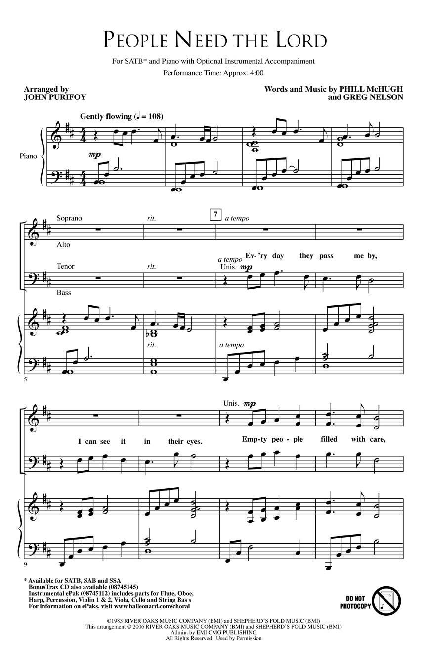 This classic inspirational song recorded by Steve Green is now available for your choir in an uplifting and stirring treatment by John Purifoy. The text and music become one to express a message of love, hope and caring. Perfect for Sundays of service, missions and self-awareness. Available for SATB, SAB, SSA, Instrumental ePak (parts for Flute, Oboe, Harp, Percussion, Violin 1 & 2, Viola, Cello and String Bass) and BonusTrax CD (08745145). Performance Time: Approx. 4:00