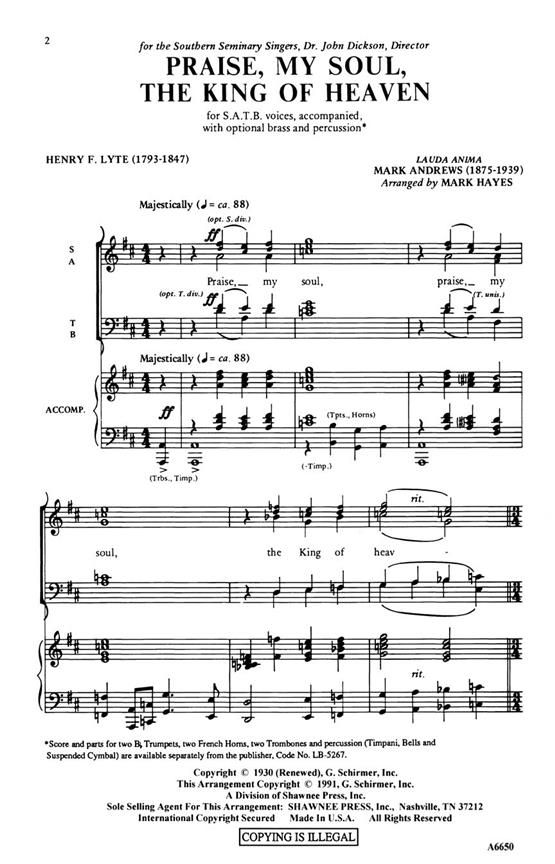 A noble hymn of faith is raised to the heights in this exalted arrangement. A fanfare-like gesture opens the work with a festive flourish and then thegreat hymn unfolds with a variety of compositional techniques. Soaring layers of sound form a vocal tapestry as the piece reaches its apex, and the final crescendo reaches dizzying heights. The brass and percussion accompanimentmakes a regal impact on this inspired music.