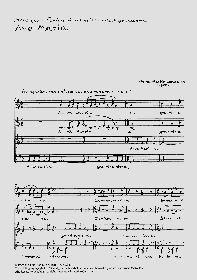 Die Quinque Precationes Ad Mariam erinnern in ihrer Klanglichkeit durchaus an Igor Strawinsky, sind aber doch auch von sehr eigenem Gepräge. Lonquich ist hier ein inspiriertes Werk gelungen, das überall, wo es bisher erklungen ist, einen starken Eindruck hinterliess. Freilich gehört es zu den Chorwerken, die einen guten, in neuer Musik nicht unerfahrenen Chor voraussetzen. Die 4 Marianischen Antiphonen und das Ave Maria haben einen je eigenen Charakter und sind alle von großer harmonischer und rhythmischer Farbigkeit. Die melodische Stimmführung bietet auch den einzelnen Stimmen eine dankbare und reizvolle Aufgabe.