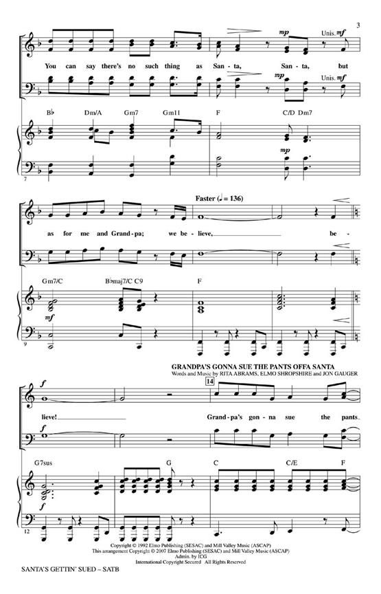 It's a laugh riot with this holiday novelty number! Includes: Grandma Got Run Over By a Reindeer, Grandpa's Gonna Sue the Pants off Santa. Performance Time: Approx. 2:50. Available separately: SATB, SAB, 2-Part and ShowTrax CD.