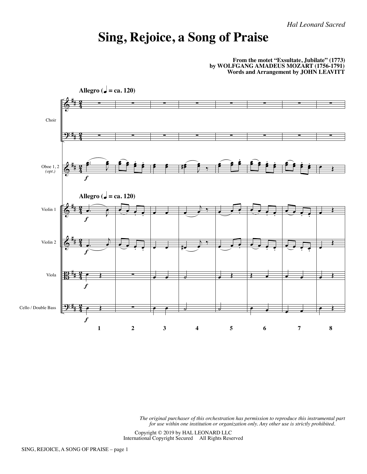 A classical music standard from Mozart's Exsultate, Jubilate leaps from the concert stage to the choir loft in this tasteful adaptation. Rich with energetic gesture, this song of unbounded praise overflows with joy. A conservative and restrained arranging hand respects the original score while opening it up to choirs of any size. A great choice for the traditional/transitional church. Score and Parts (ob 1-2, vn 1-2, va, vc, db) available as a digital download.