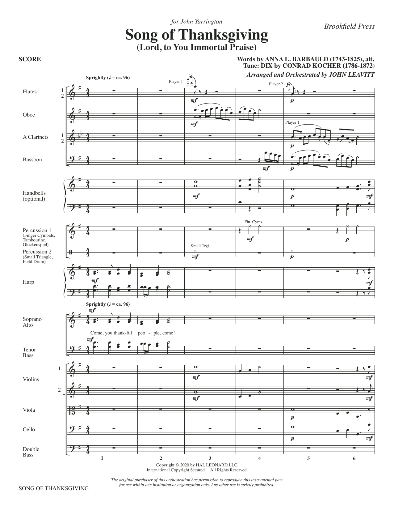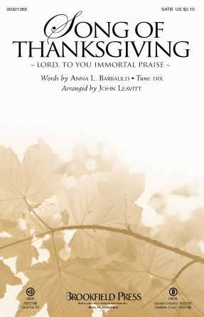 From the sprightly opening gesture of the introduction, this anthem reaches out to delight and invigorate. The main theme is the familiar DIX tune, creatively joined with an alternate text to offer a vivid reminder of God's blessings. This pairing features dazzling figurations in the textures of the piano/orchestra as each verse comes alive in a dynamic dance of praise and gratitude. Crowned with a joyful Alleluia! this sacred choral song will put a joyful finishing touch on your Thanksgiving worship. Score and Parts (fl 1-2, ob, cl 1-2, bn, perc 1-2, hp, vn 1-2, va, vc, db) available as a digital download. Part for Handbells (3 oct.) also available as a digital download.