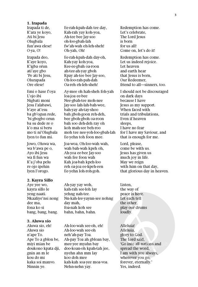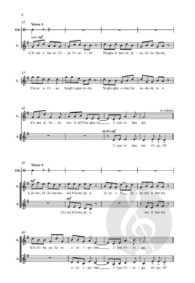 Fred Onovwerosuoke presents six authentic arrangements of African songs scored for upper voices and percussion. Published in two small collections - this set for SA and the second for SSA - the songs originate from a variety of locations, including Zimbabwe, Botswana, Nigeria, and the Republic of Benin.