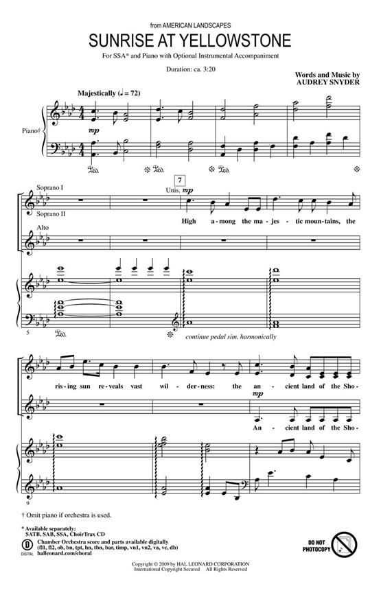 The mystery and majesty of Yellowstone is perfectly portrayed in this choral tone poem that celebrates the beauty of this American treasure. An ideal concert and festival work, it may be performed by voices and piano or with the optional orchestration. Available separately: SATB, SAB, SSA, ChoirTrax CD. Duration: ca. 3:20.