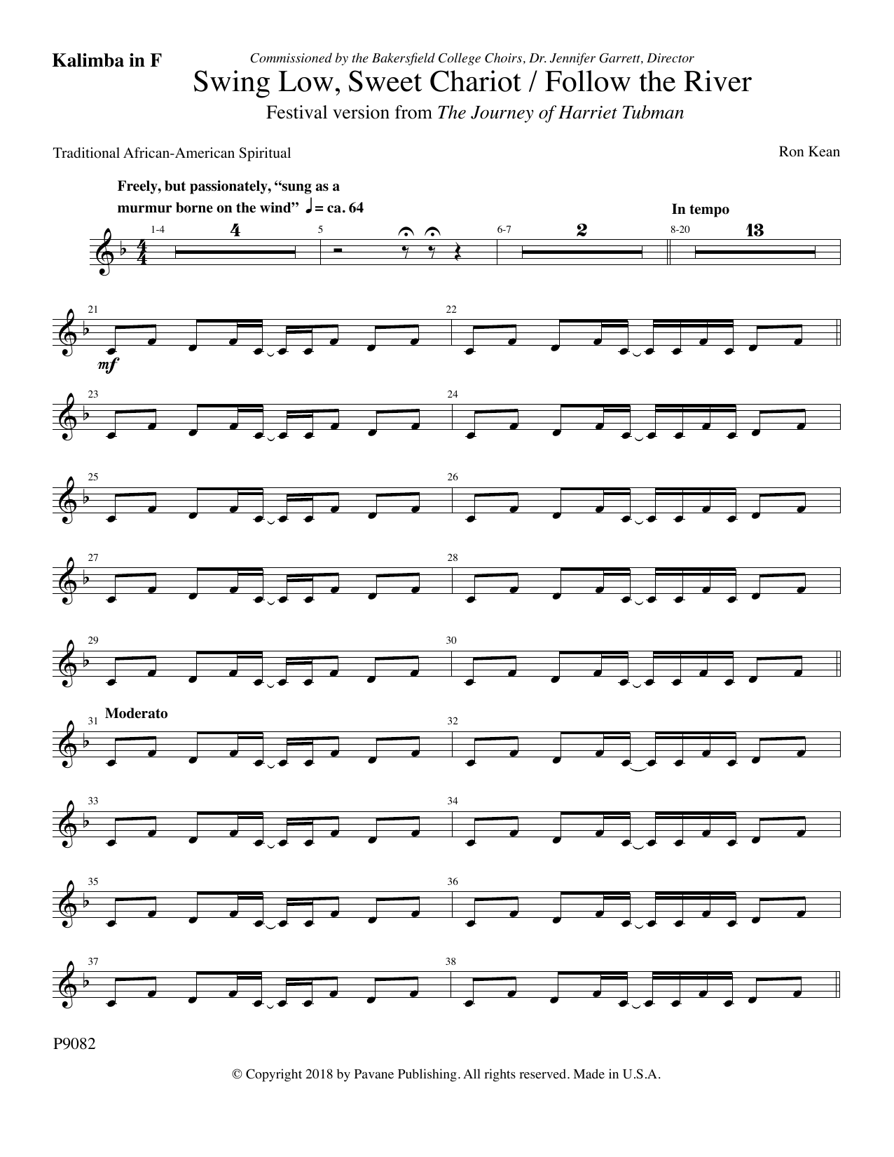 Der Komponist und Dirigent Ron Kean ging zurück zu den Wurzeln der Spirituals, zurück nach Afrika, um eine Vertonung dieses beliebten Spirituals in einem bemerkenswert anderen Stil zu schaffen. Der gemischte Chor ist Teil des größeren Werks The Journey of Harriet Tubman und wird von Kalimba und Marimba begleitet. Eine Solostimme und Bodypercussion für den Chor sind ebenfalls enthalten. Ein hervorragendes Werk für Festivalchöre. Mittel bis schwer.