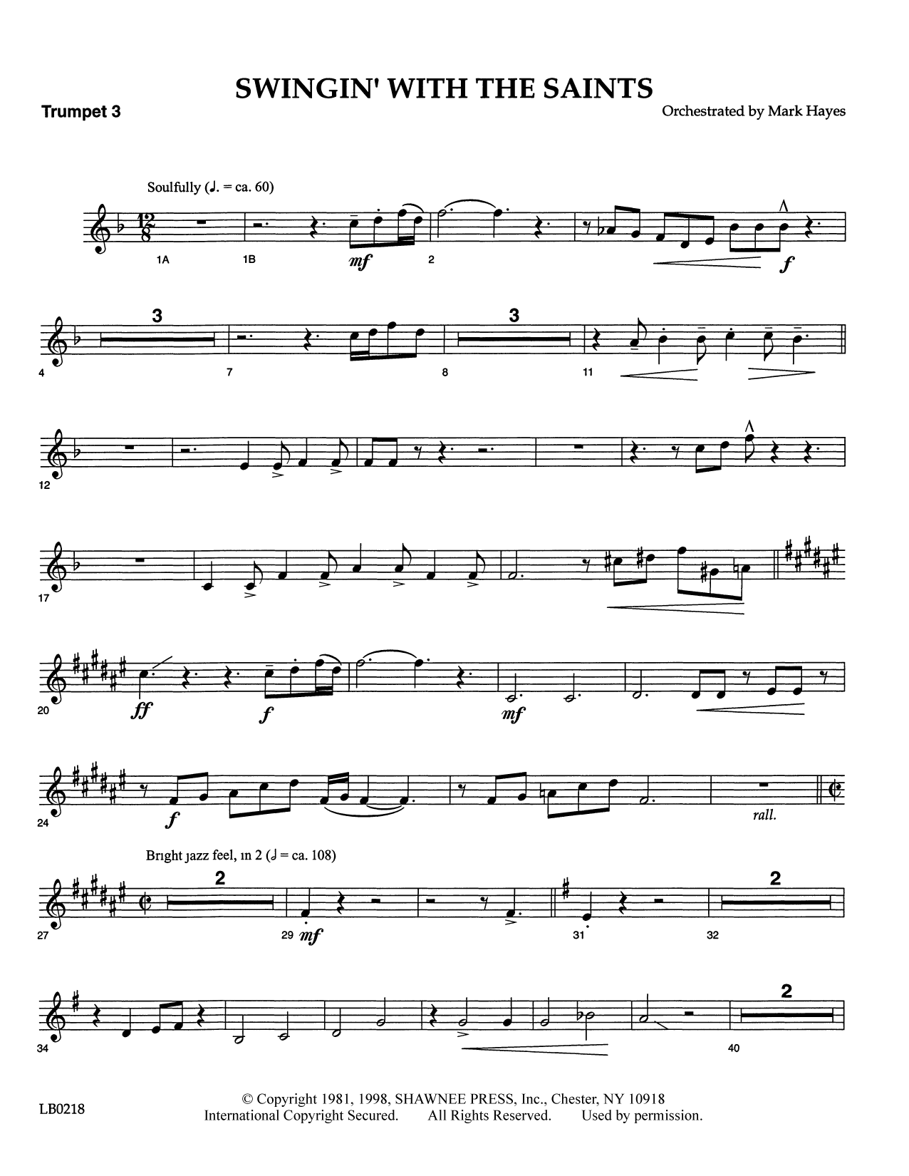 Swing Low, Sweet Chariot and When the Saints Go Marching In really belong together in this dynamic, soulful setting, which contrasts the two classic spirituals in such an exciting way that your choir won't want it toend! Skillfully arranged for singers. Available separately: SATB, SAB, 2-part, TTB, SSA, Instrumental Accompaniment (Score, Bass, Trombone 1, Trombone 2, Bass Trombone, Percussion, Drums, Electric Guitar, Alto Sax 1, Alto Sax 2, Tenor Sax 1, Tenor Sax 2, Baritone Sax, Trumpet 1, Trumpet 2, Trumpet 3), StudioTrax A/P CD.