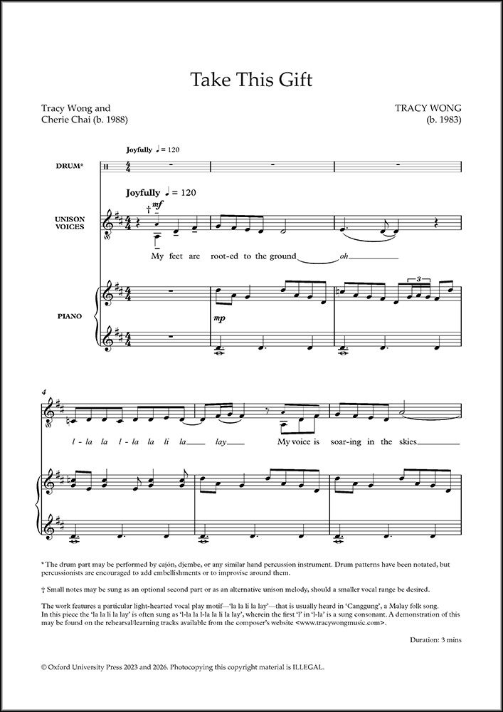 Presented here in a version for unison voices (with optional second part), this piece is characterized by catchy melodies and a syncopated rhythmic drive, including a light-hearted vocal play motif ('la la li la lay') that is usually heard in 'Canggung', a Malay folk song.