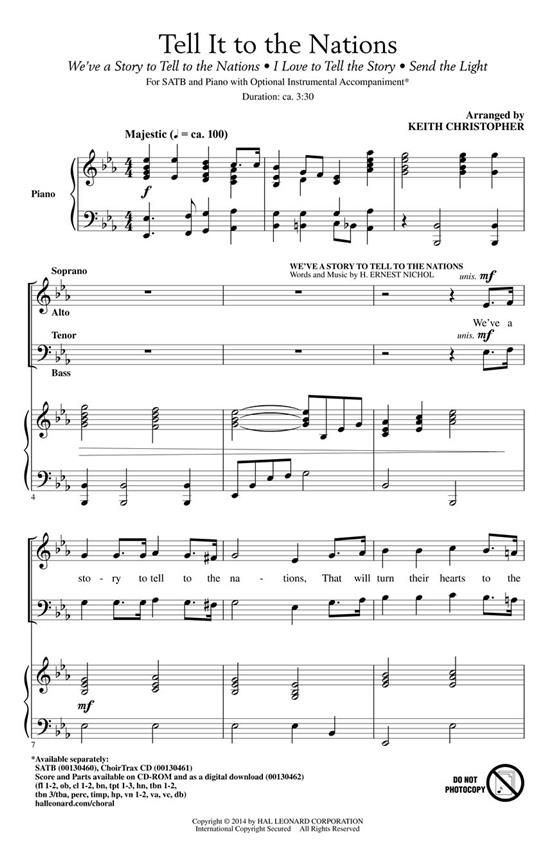 Uses: General, Missions, Social Justice, Revival Scripture: Matthew 5:13-16; Matthew 28:18-20 This is a super medley of popular mission hymns that will raise the spirits of your people. Crafted with great flair, this energizing number will produce a hearty response from the faithful. Whether presented with the cheerful piano accompaniment or with full orchestration, you will find this montage to be satisfying at every level. Score and Parts (fl 1-2, ob, cl 1-2, bn, tpt 1-3, hn, tbn 1-2, tbn 3/tba, perc, timp, hp, vn 1-2, va, vc, db) available on CD-ROM.