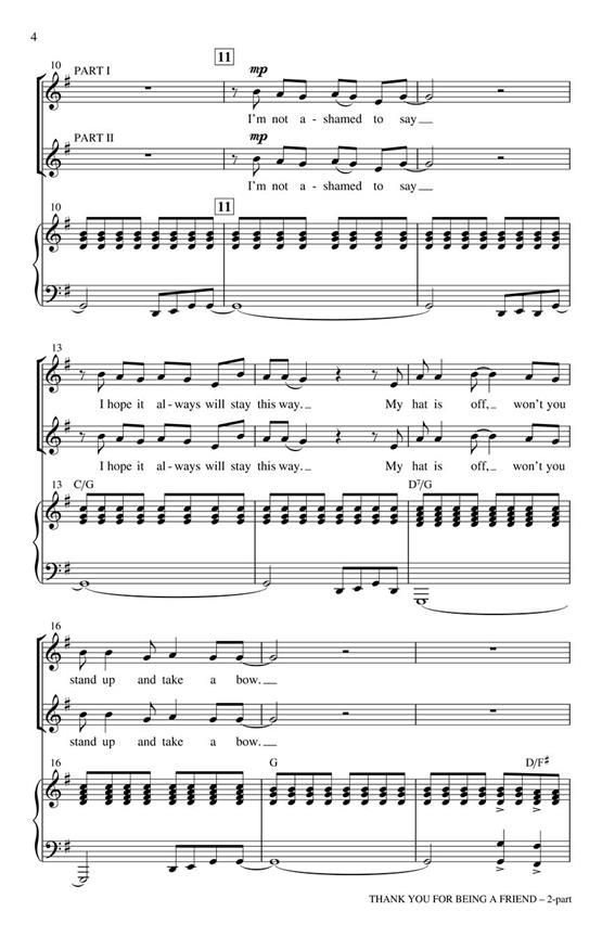 The theme from the T. V. series, The Golden Girls roars to new life due to the recent Betty White fan crazy and is now available for your choir to sing and enjoy! Bright, happy, and a perfect song for celebrating friendship! Your heart is true, you're a pal and a confidant. Available separately: SATB, SAB, 2-part, StudioTrax CD. Duration: ca. 4:00.