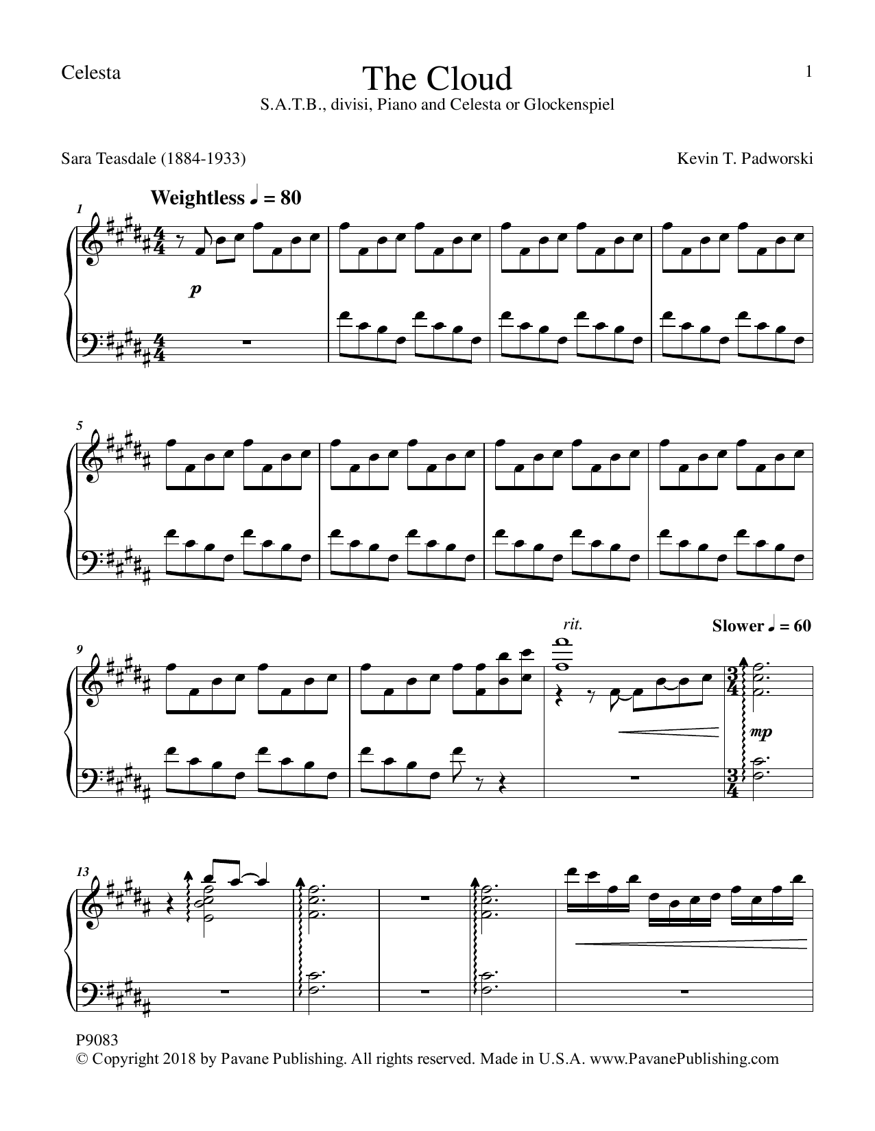 If there ever was a piece that describes a text in song, this is it. Sara Teasdale's descriptive words about the clouds become sound in this exquisite composition. Accompanied by piano and celesta, a glockenspiel part is also provided for those who have no access to a celesta. Great for festivals or a concert at any season, this is a piece that is a joy to share. Medium in difficulty.