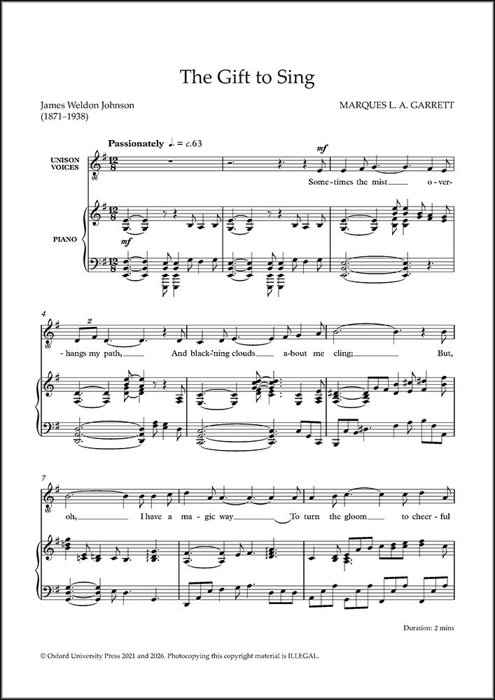 Presented here in a version for unison voices (with optional second part), this piece is a compelling setting of words by American writer and civil rights activist James Weldon Johnson that speaks to the way the power of song can help to overcome dark times.
