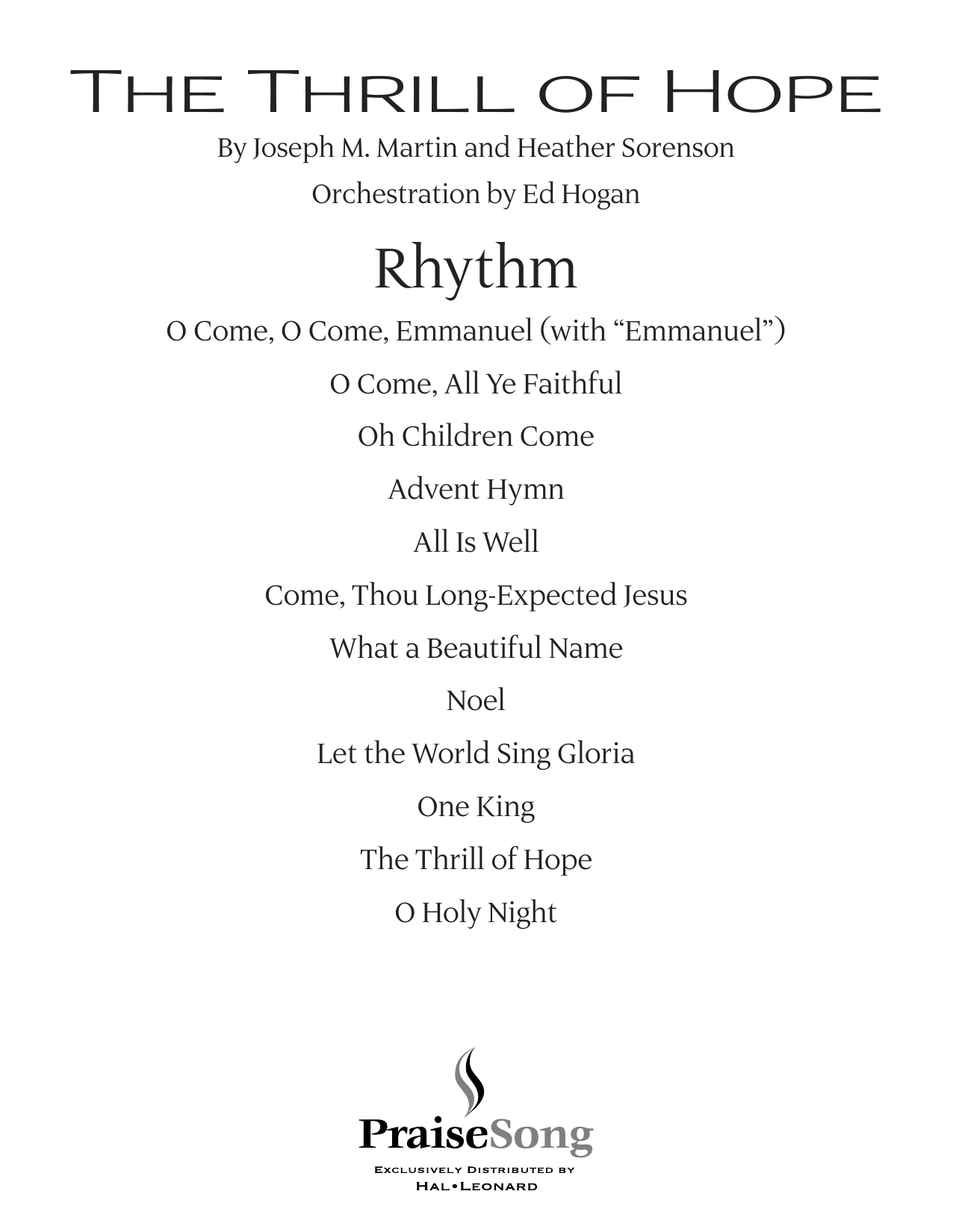 Combining traditional carols with the best of today's contemporary Christian seasonal selections, this cantata is an ideal choice for the traditional/transitional church. Using the well-known Lessons and Carols template, this work brings it all together for an outstanding blend of old and new. A fresh version of the traditional lessons written in modern language is a special feature. The work includes opportunities for the congregation to participate and as well as options for children's choir. Tell the old, old story in a brand new way with The Thrill of Hope.