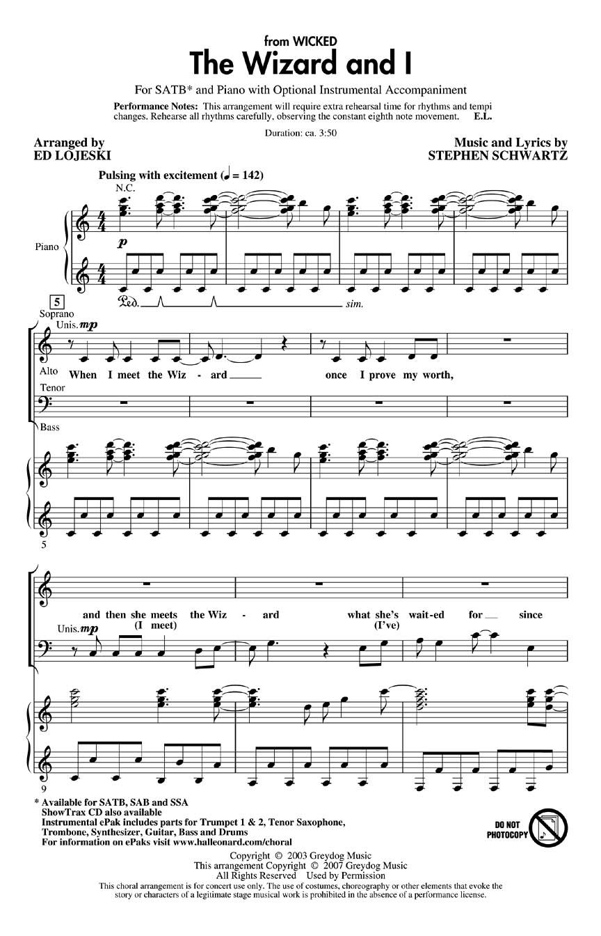 The Broadway hit Wicked continues to enchant audiences all across the country. In this song, Elphaba dreams of the life before her and her dreams for the future. Available for SATB, SAB and SSA. ShowTrax CD also available. Instrumental ePak includes parts for Trumpet 1, 2, Tenor Sax, Trombone, Synthesizer, Guitar, Bass and Drums. Duration: ca. 3:50