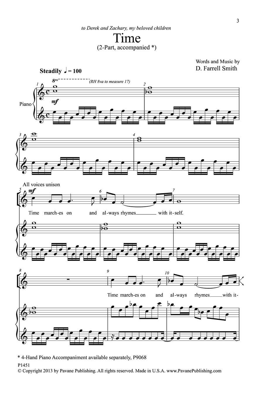 This piece sounds exactly like its title: time. This wonderful children's song claims how time marches on and you can feel it pacing steadily forward with a dynamic piano part (the 4-hand one, available separately, P9068, is even more fun). Children will enjoy singing this selection and it will be a favorite at any school concert.
