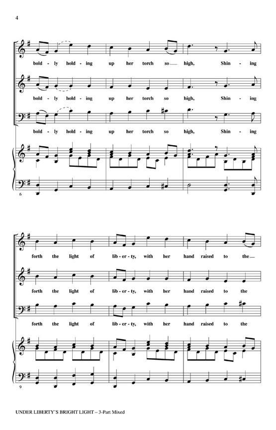 Celebrate our American liberty with this work based on the familiar melody of Haydn's String Quartet Op. 76, No. 3. Original lyrics describe Lady Liberty standing tall with her torch held high. Ideal for choirs with changing voices, invite your string orchestra to accompany your performance. Level 2. Available for 3-Part Mixed, Instrumental ePak (score and parts for Violin I & II, Viola and Cello) and VoiceTrax CD. Performance Time: Approx. 2:00
