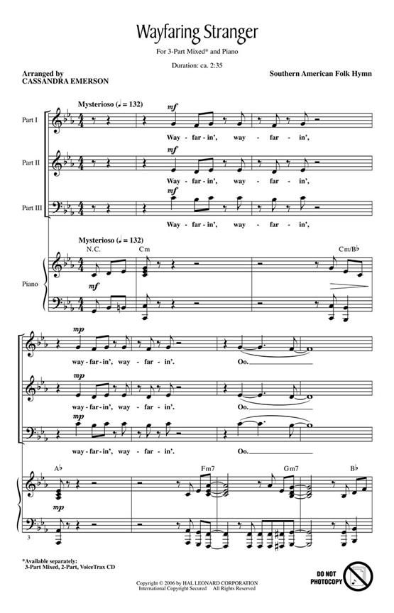 Rhythmic vocal motives contrast with the long lines of the traditional folksong in this distinctive setting. Contemporary piano textures support the choral harmonies in an easily-learned and dynamic Discovery concert series showcase. (Also available for SATB, #08745095) Available separately: 3-Part Mixed, 2-Part, VoiceTrax CD. Duration: ca. 2:35.