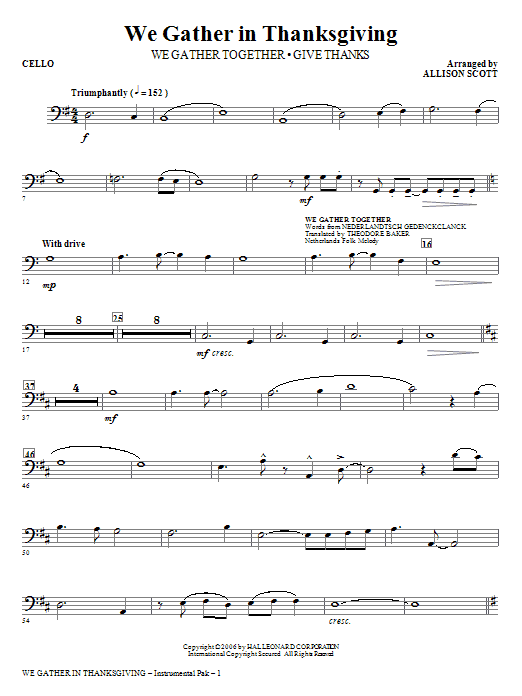 We Gather Together and Give Thanks are paired in a fresh and rhythmic setting that is full of joy and praise. Available for SATB, SAB and SSA. Instrumental ePak includes score and parts for Guitar, Bass, Drums, Violin 1, 2, Viola, Cello and String Bass. ChoirTrax CD also available. Performance Time: Approx. 2:45