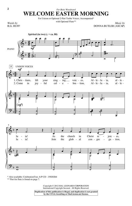 A spirited piece in 2/2 meter, this Easter anthem calls the 'global congregation' to sing together the joyful alleluias of Christ'sresurrection. A sparkling piano accompaniment highlights the charming melody that's easy to learn and fun to sing. A clever flute part at the end of the anthem weaves in short, familiar phrases of Christ the Lord Is RisenToday. Available separately: Unison/opt. 2-Part Treble, CelebrationTrax CD. Duration: ca. 1:43