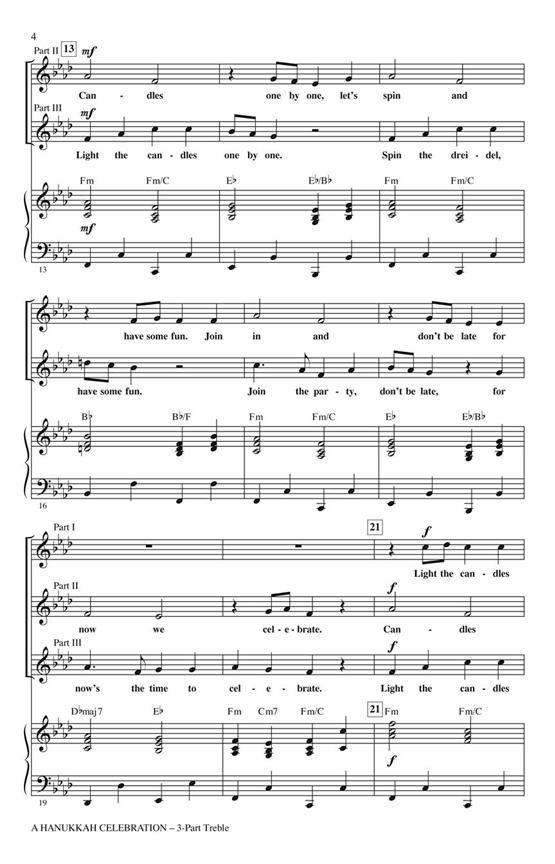 All the varied joys of Hanukkah are celebrated in this upbeat and well-crafted original work that is ideal for younger and developing choirs. Layered partner melodies, canonic and imitative sections make rehearsal easy and fun and performance a success! Optional melody instrument part included. Available separately: 3-Part Mixed, 3-Part Treble, VoiceTrax CD. Duration: ca. 2:15.