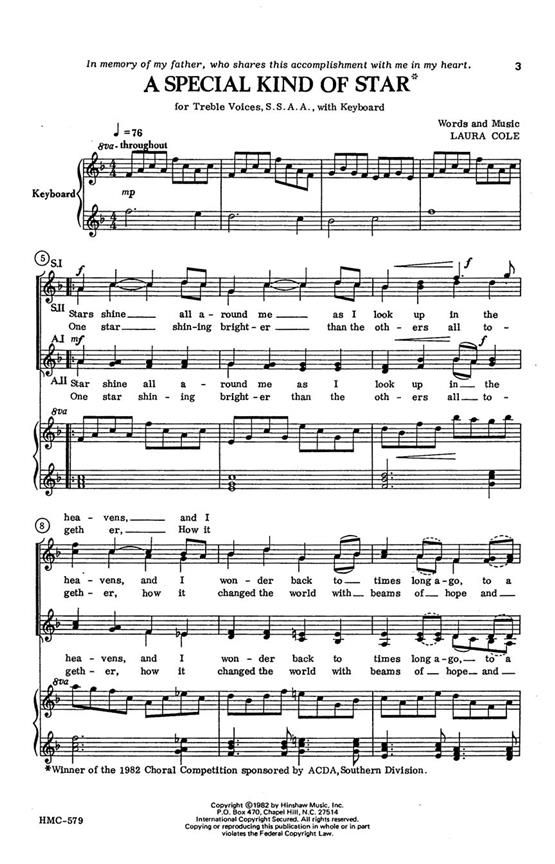 A lovely piece for church, school, or community chorus that is about the Christmas star, though the reference is oblique. It is a thought-inspiring piece, for SSAA and keyboard that is easily learned and very effective, winner of the 1982 choral competition sponsored by ACDA, southern division.