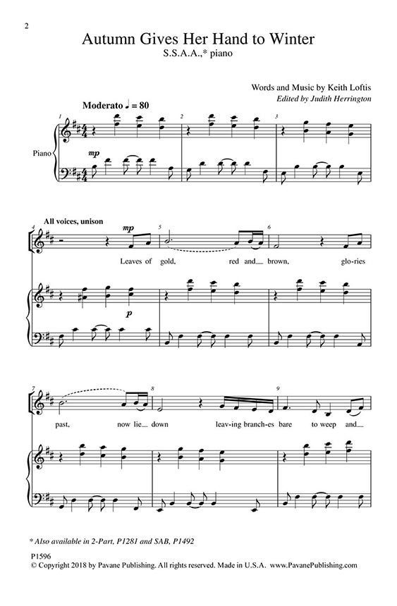 Originally released as a 2-part piece, this selection continues to be one of the most popular in the Pavane catalog. This new voicing celebrates the same metamorphosis from fall into winter but arranged for 4-part treble choir. A favorite concert selection for fall concerts, the text and tune capture the turning of the leaves in song.