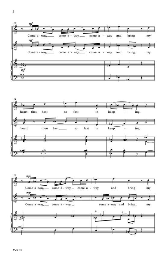 This is a pair of short songs for two-part choir and piano. The first is a lullaby titled Sweet, Come Away and the second, When Laura Smiles is a lively serenade. These two songs set Renaissance text with new music.