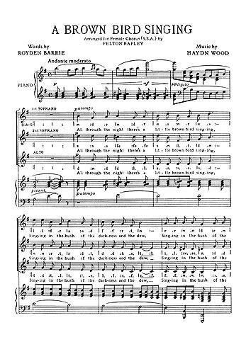 A Brown Bird Singing, published in 1922, is second only to The Roses of Picardy in popularity among Wood's vast oeuvre. With lyrics by composer Royden Barrie, the romantic words are well matched to the touching melody. The song has been recorded many times since it appeared, including a version by jazz songstress Peggy Lee and one arranged for zither. Haydn Wood (1882-1959) earned his reputation as a giant of British light music in the twentieth century through a prolific career that encompassed performance as Violin soloist and conductor and as well as composer of some of the nation's favourite melodies. Wood was not only was a gifted and popular creator of Orchestral works andmusical theatre, but also the composer more than 200 songs, many of them the greatest hits of their era. A Brown Bird Singing has been arranged for SSA female chorus by Felton Rapley.