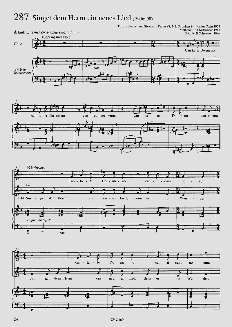 Chorsätze zum Evangelischen Gesangbuch, meist für Chor SSA, z.T. mit Instrumenten. Im Schwierigkeitsgrad sind die meisten Sätze leicht bis mittelschwer. Diese Publikation zeigt sehr deutlich, dass der Verzicht auf Männerstimmen keine Qualitätsminderung bedeutet. Eigenständige Frauenchorsätze, wie sie hier zu finden sind, haben ihren besonderen Reiz und erfreuen sich immer grösserer Beliebtheit. Das Chorbuch enthält 87 (2-4stg) Bearbeitungen, von zum größten Teil lebenden Autoren und Komponisten. Da der Herausgeber sich nicht auf leichte Sätze beschränkt hat, sondern auch grössere Werke aufgenommen wurden, ist sicherlich für jeden Chor genügend geeignete Literatur vorhanden. Diese hervorragend gemachte Veröffentlichung sollte jeder Chorleiter besitzen.' (Musica Sacra)