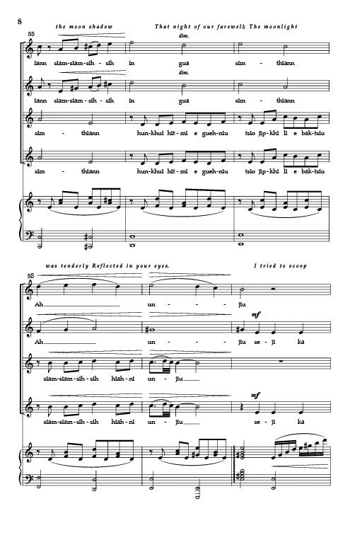 Floating Moon on the Water uses a beautiful text in Taiwanese by Wei-Pin Chen. Using western tonality blended with Taiwanese elements, the melody begins with a touch of sadness and is followed by flowing sounds of pictures on the water. A gorgeous work in a unique language. Jo-Michael Scheibe Choral Series.