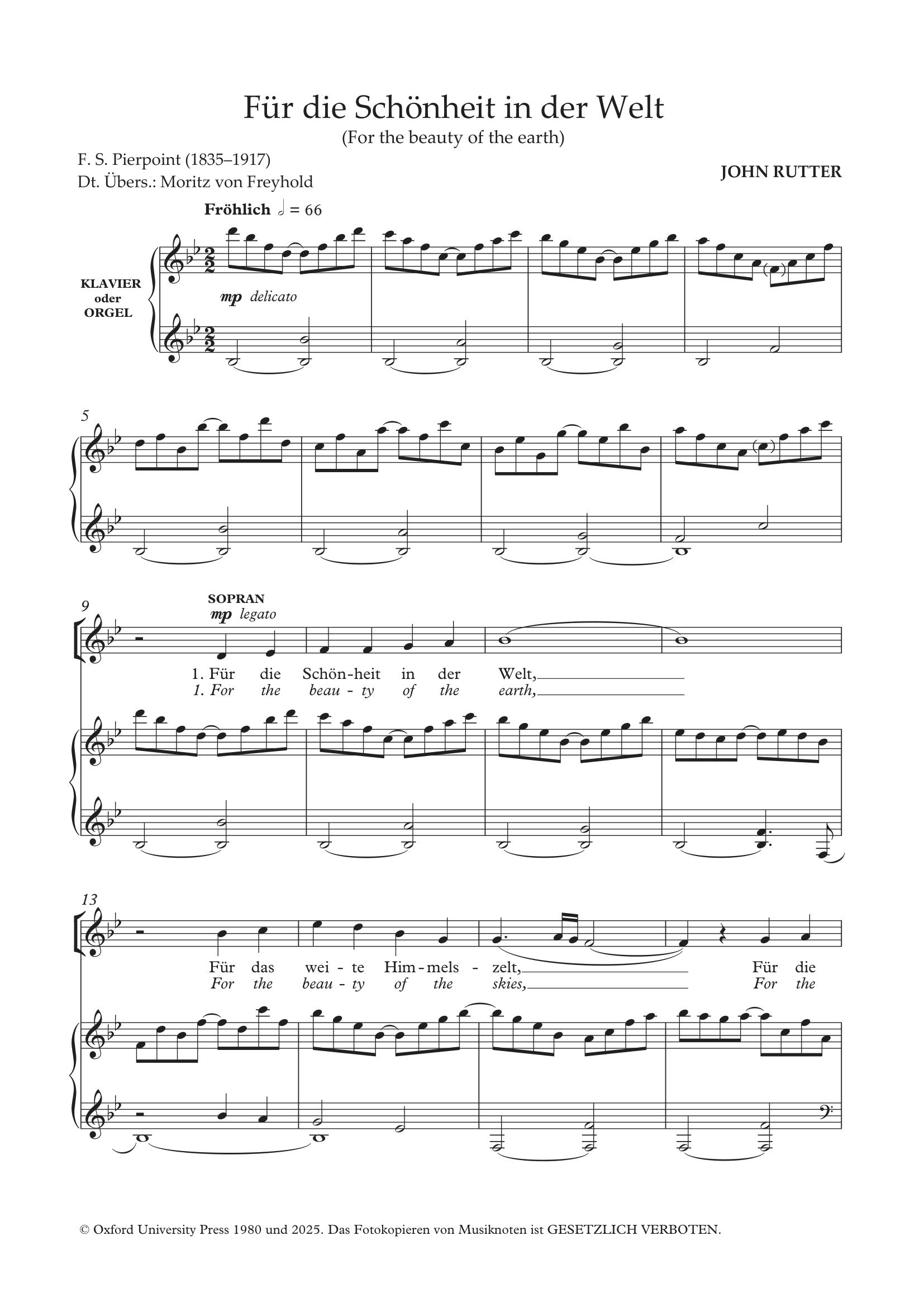 In this classic Rutter anthem the flowing choral melodies perfectly complement the positive message of the well-known thanksgiving text by F. S. Pierpoint, presented here in German translation.. The orchestral accompaniment is available on sale and hire/rental.
