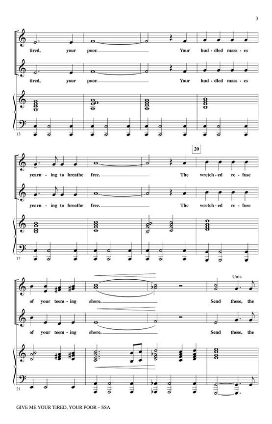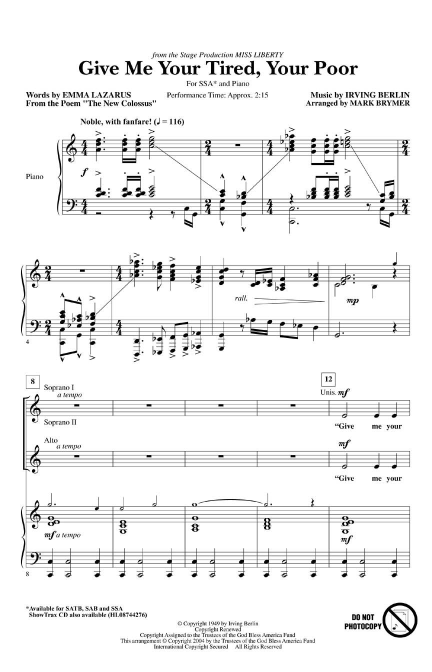 Give me you tired, your poor, your huddled masses yearning to breathe free. These moving words penned by Emma Lazarus are set in stone at the bottom of the Statue of Liberty as a reminder that all are welcome here. Irving Berlin set these words to music in 1949 and the piece has become a classic in patriotic repertoire. Performance time: Approx. 2:15. Available for SATB, SAB, SSA and ShowTrax CD.