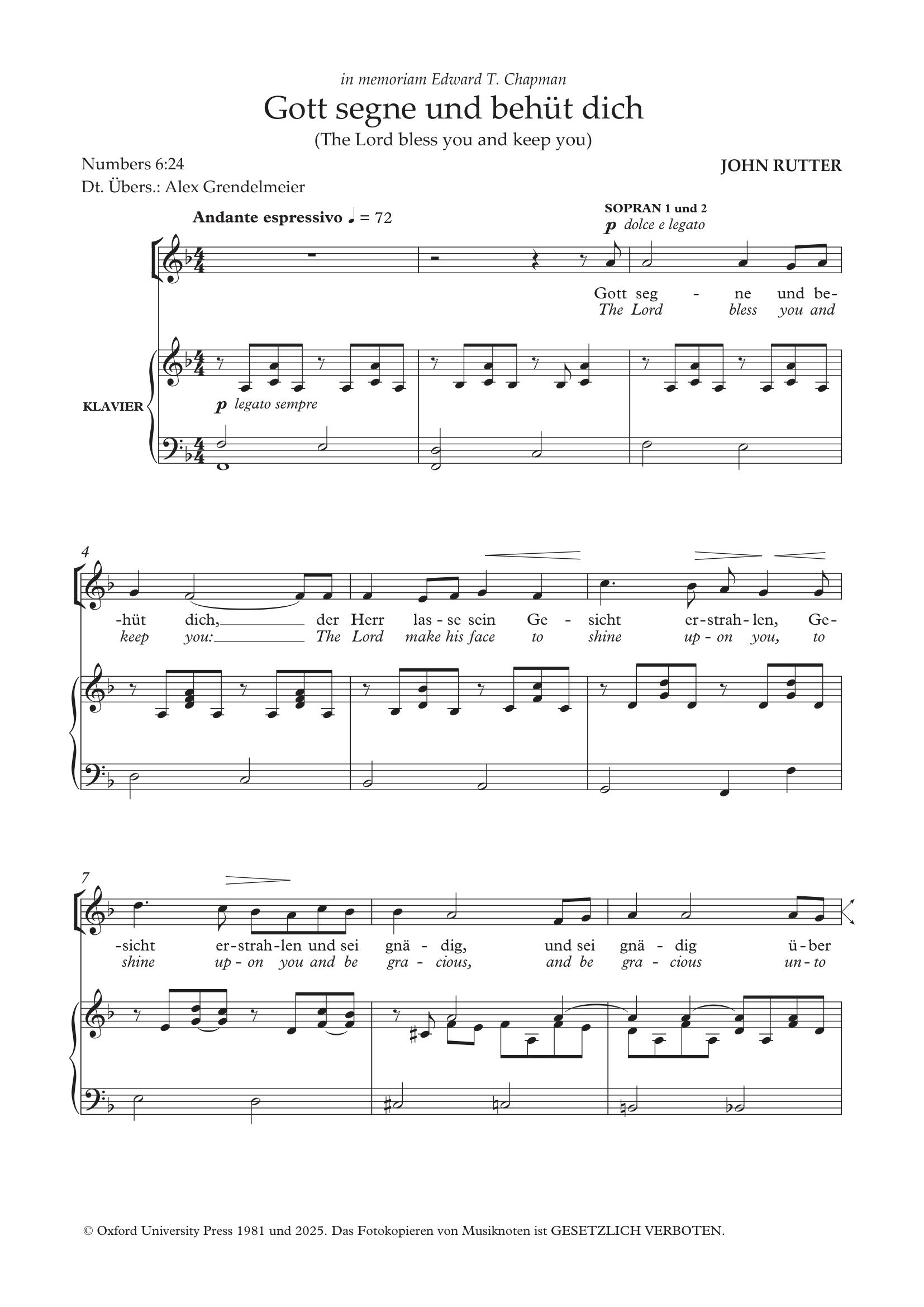 A highly expressive setting of the biblical text, this simple work is at once tender and profound. It was composed for a memorial service for Edward T. Chapman, the Director of Music at Highgate School, where John Rutter was a pupil. Presented here in German translation.