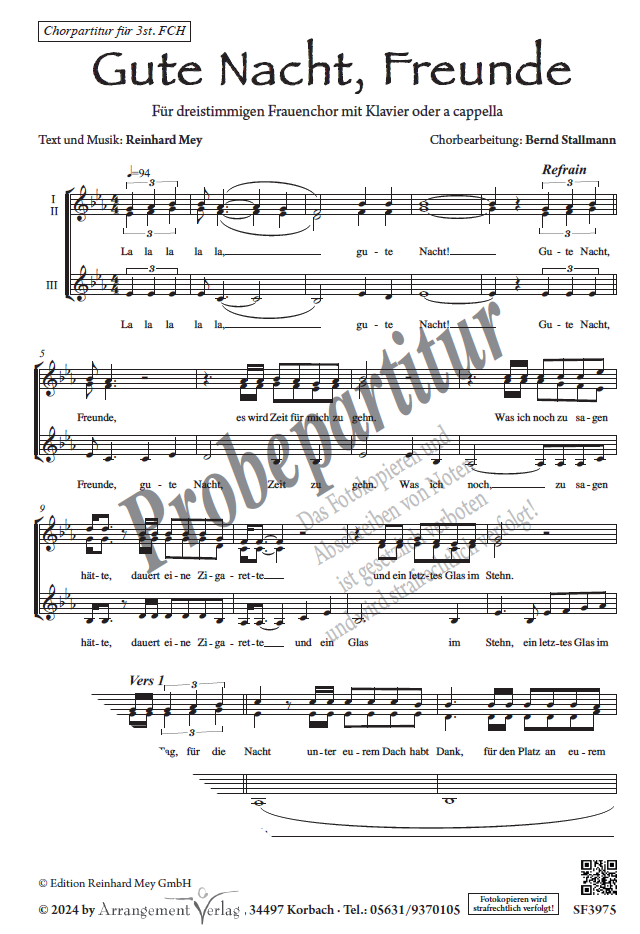 "Gute Nacht, Freunde" wurde von Alfons Yondraschek (Reinhard Mey) geschrieben. Mit diesem Lied nahmen Inga & Wolf am deutschen Vorentscheid des "Eurovision Song Contest" 1972 teil und erzielten einen vierten Platz. Erst danach wurde es von Reinhard Mey veröffentlicht. Dieses Chanson gehört mittlerweile zum deutschen Kulturgut und hat generationenübergreifend Kultstatus erlangt. In unserer dreistimmigen Chorversion ist der Titel sowohl a cappella als auch mit Klavier zu singen.