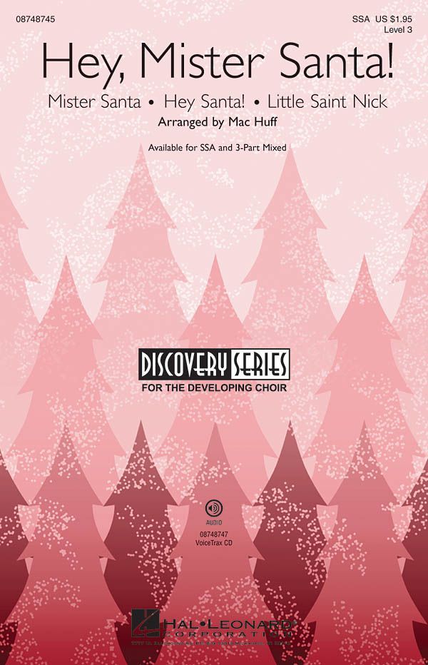 Three Santa songs combine for a cute and clever salute to the man of the hour! This mini-medley includes: Hey Santa!, Little Saint Nick, Mister Santa. Available separately: SSA, 3-Part Mixed, VoiceTrax CD. Duration: ca. 3:45.