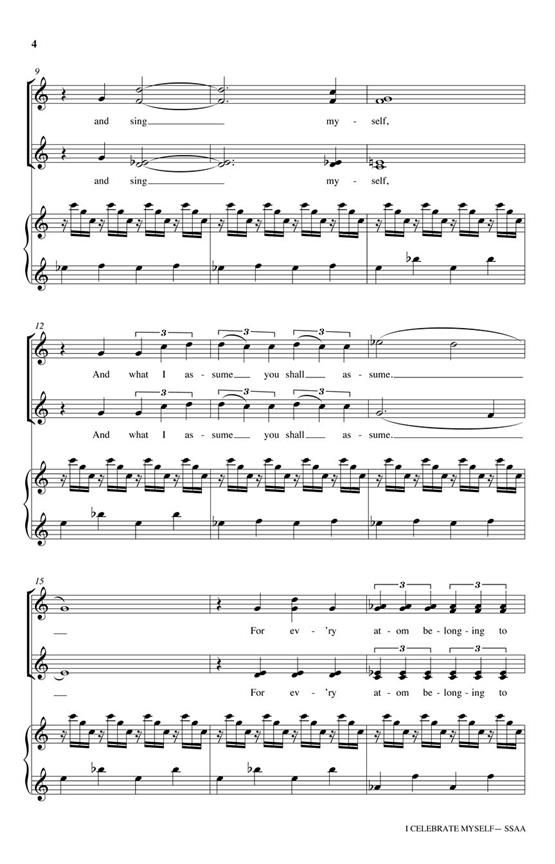 The Walt Whitman poem Song of Myself conveys both a sense of confidence and a spirit of adventure. The text affirms our uniqueness as individuals but also stresses our interconnectedness to each other and the world. The music captures these characteristics with a constant drive and sense of excited anticipation.