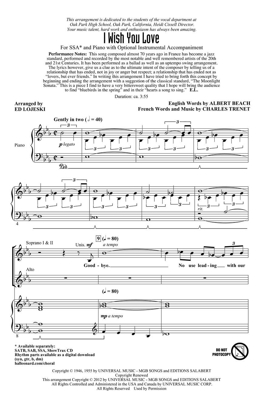 This song composed almost 70 years ago in France has become a jazz standard, performed and recorded by the most notable artists of the 20th and 21st centuries. This ballad setting captures a quasi-classical feel and a suggestion of Beethoven's Moonlight Sonata, that gives it a nostalgic quality and the hope that the audience might find bluebirds in the spring and in their hearts a song to sing. Available separately: SATB, SAB, SSA, ShowTrax CD. Duration: ca. 3:55.