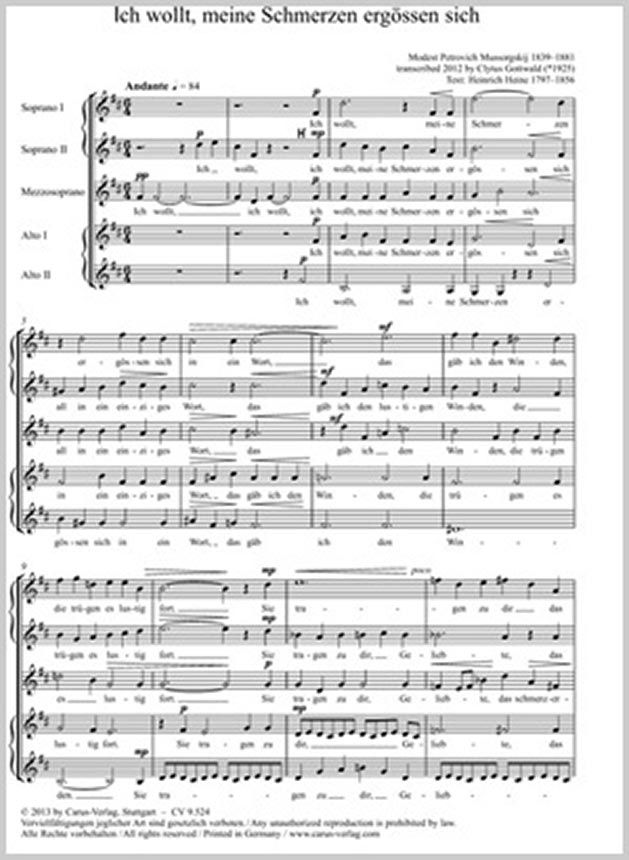 Transkription für Chor [Originalbesetzung: Singstimme, Klavier]. 'Mussorgskijs Lied Ich wollt, meine Schmerzen ergössen gehört zu den wenigen Kompositionen, für die der Komponist einen deutschen Text von Heinrich Heine verwendete. Da Melodie und Begleitung sich in einem Umfang bewegen, den man in der alten Musik als Hohe Chiavette bezeichnete, entschloss ich mich zu einem Satz für fünfstimmigen Frauenchor.' [Gottwald]