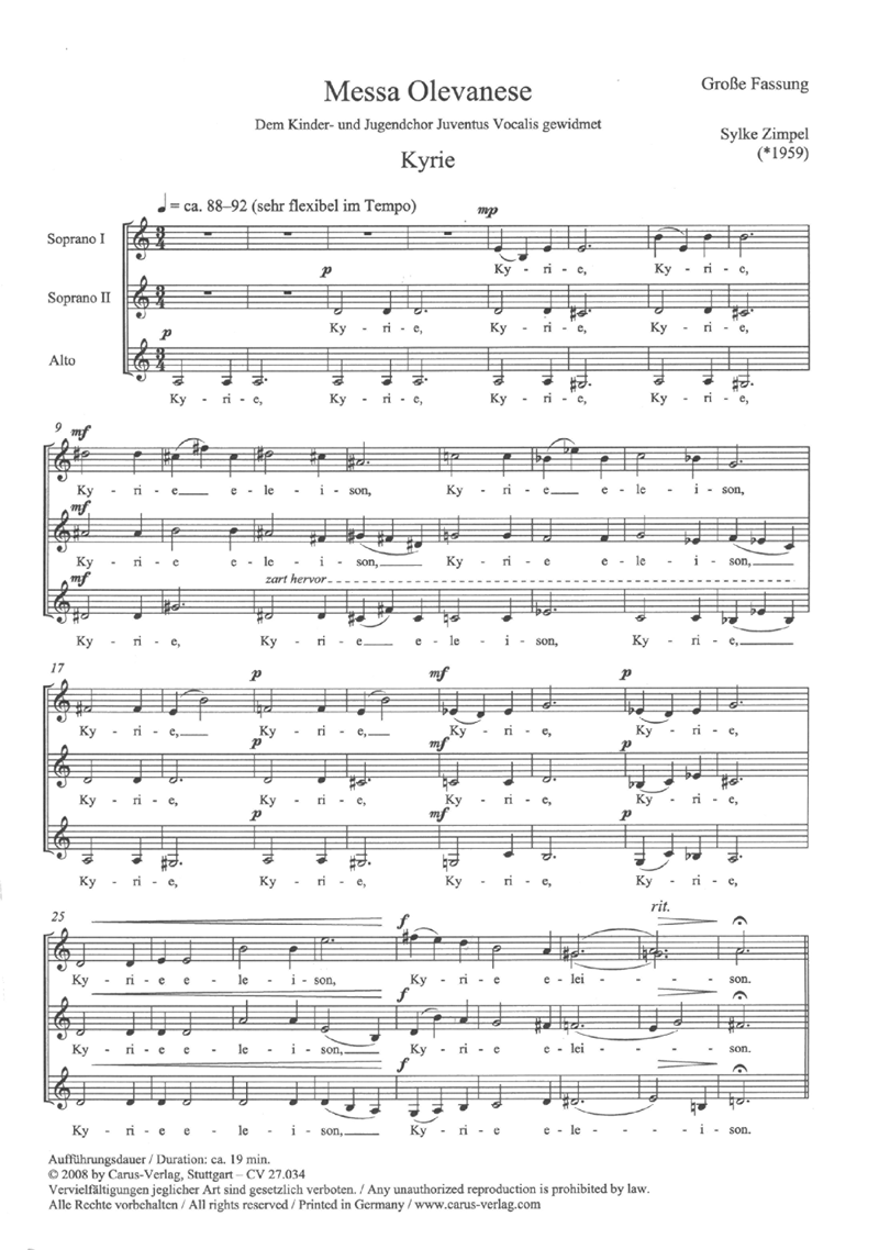 Klangpoesie und Leuchtkraft kennzeichnen die anspruchsvolle, aber doch gut machbare Messa. Für die mehrchörige Ausführung ist kein zusätzlicher Notentext zu lernen, da die Doppelchörigkeit durch kanonische Verschachtelung entsteht. In dieser Form ist die Messe ideal geeignet für Chortreffen und Festivals. Ein Chor, der nach der doppelchörigen Ausgabe probt, kann die Messe sowohl einchörig als auch doppelchörig aufführen. - Coro SSA/SSA