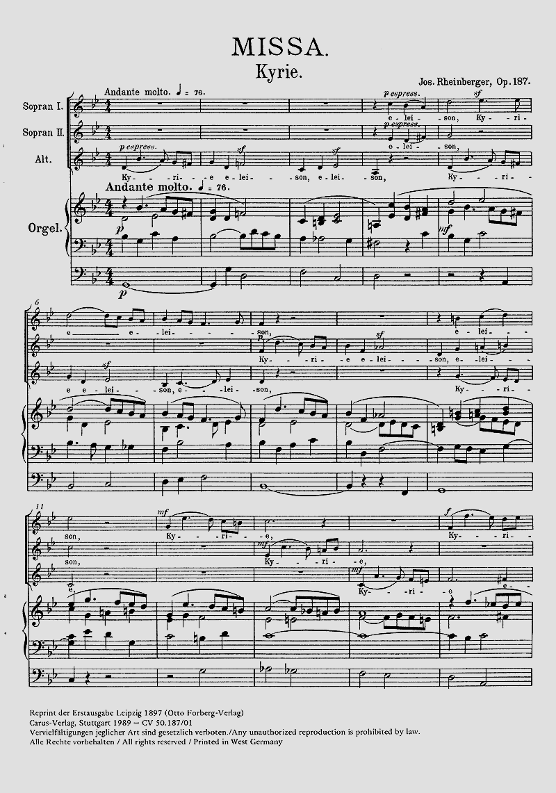 sincere in memoriam - Während der Komposition erfuhr Rheinberger, dass Johannes Brahms gestorben war. Die Messe ist dem verehrten Meister, mit dem ihn eine persönliche Bekanntschaft verbunden hatte, 'sincere in memoriam' gewidmet. Coro SSA, Org, [Soli SSA]