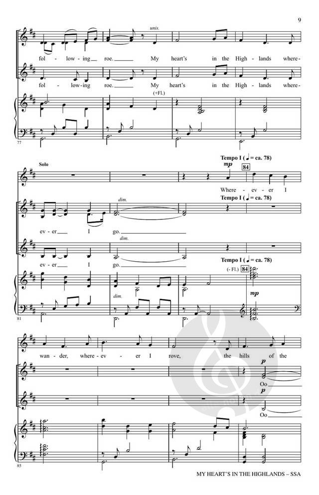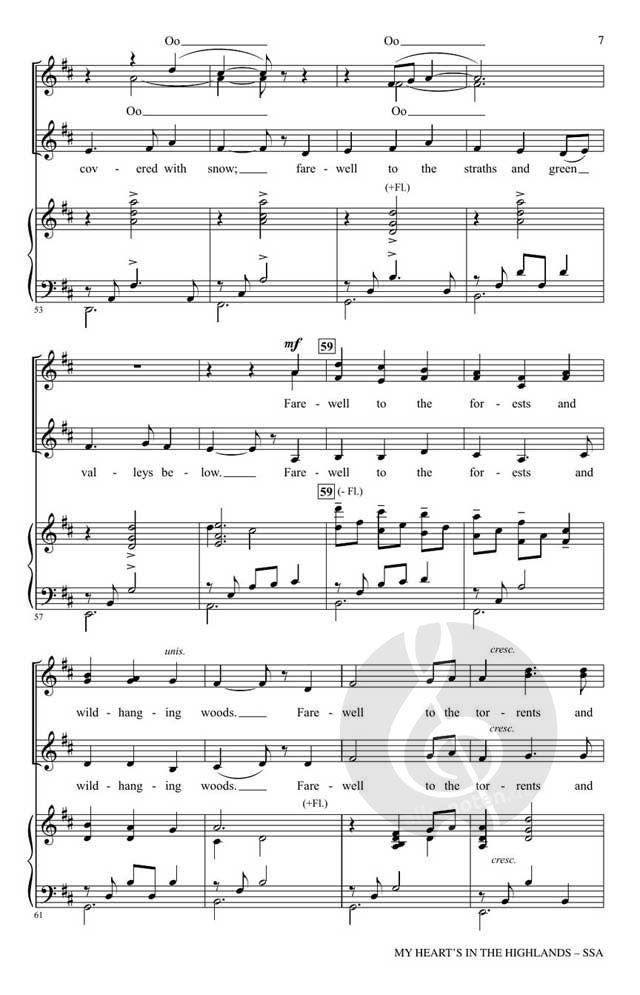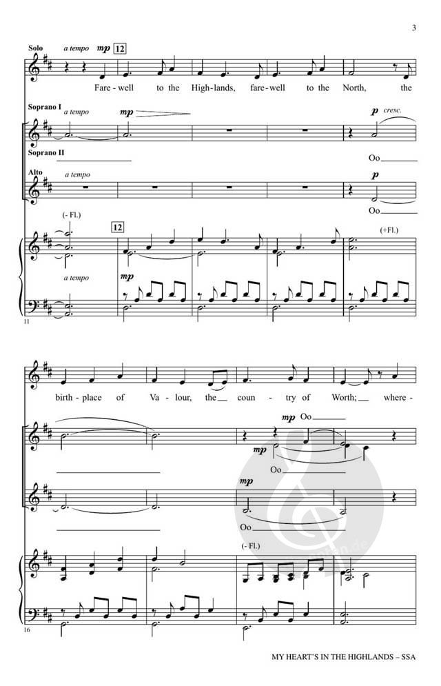 Mit einem fließenden Klavier und einer obligaten Flöte im keltischen Stil ist diese zarte Vertonung des Gedichts von Robert Burns ein Lied von stiller Kraft und tiefer Emotion. Basierend auf einer schottischen Melodie ist das Werk wunderschön für gemischte und dreistimmige Stimmen intoniert. Reiche Harmonik füllt das Stück und bietet Momente für solistische Möglichkeiten.