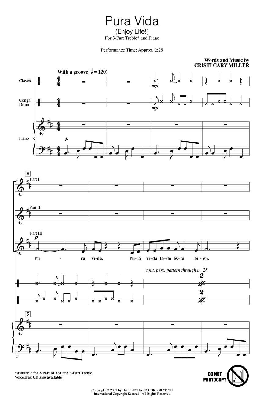 This Latin original is just brimming with energy! Rhythmic vocal lines are layered over an infectious groove to send a message to enjoy life! Level 1. Available for 3-Part Mixed, 3-Part Treble and VoiceTrax CD. Performance Time: Approx. 2:25.