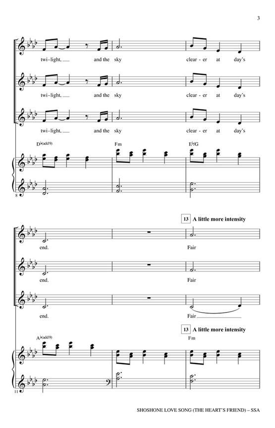 Now available in an SSA voicing, this tender setting of a Native American poem features extended legato phrasing and delicate musicality. The simple piano accompaniment supports the expressive vocal textures. Ideal for concert or festival programming!