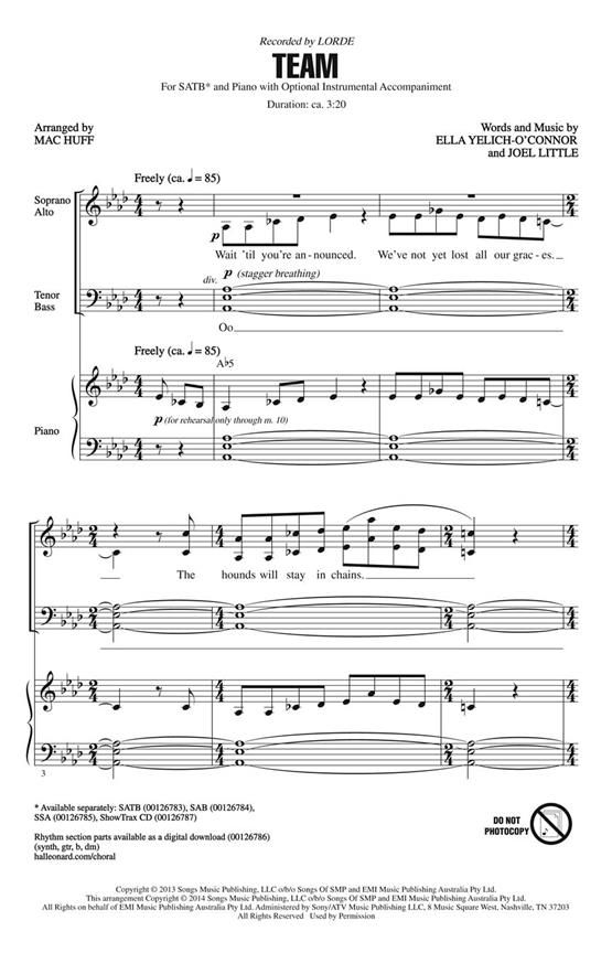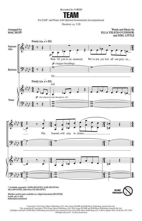 Soaring up the 2014 charts, this follow-up hit by the young New Zealand recording artist Lorde connects with fans through meaningful lyrics, a minimalist drum beat and fresh electronic sounds for a result that pop and show choirs will love to recreate!