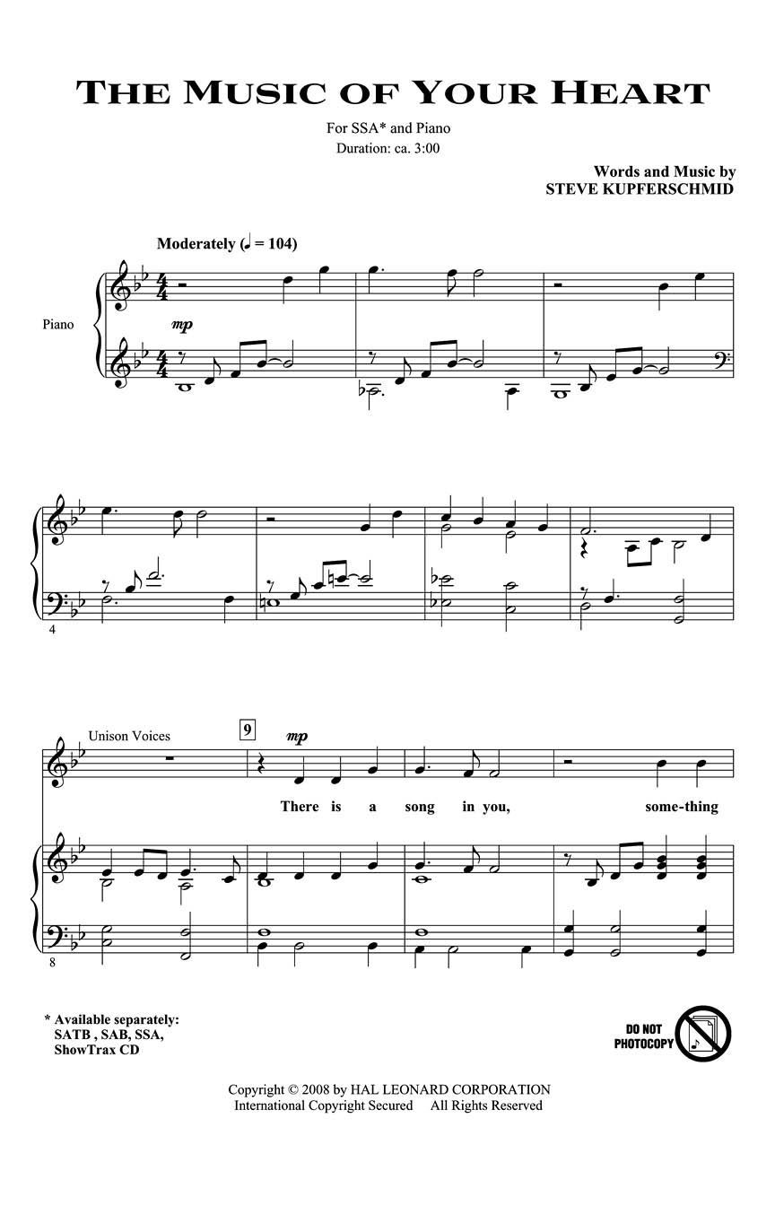 There's a song in you, something strong and true in the music of your heart. Let the music lift you up with this expressive original work with an uplifting message that will resonate with your choir and audience. Available separately: SATB, SAB, SSA, ShowTrax CD. Duration: ca. 3:00.