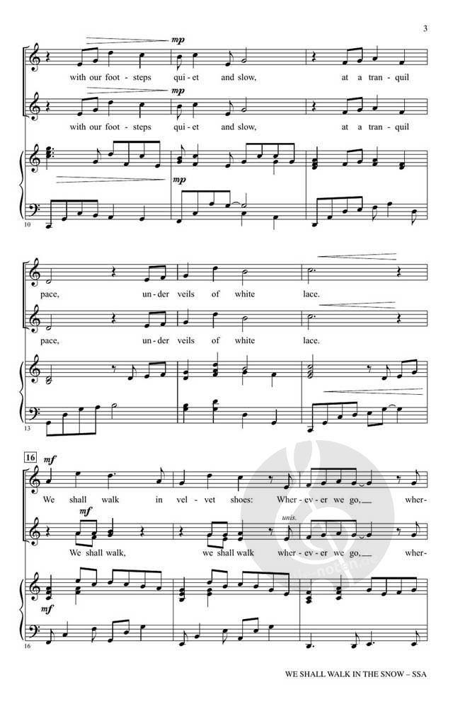 Ausgewählte Zeilen aus dem Gedicht "Velvet Shoes" werden mit Unisono-Gesang vertont, der in eine üppige Harmonik mündet: alles unterstützt von einer kunstvollen Begleitung. Diese zugängliche SSA-Winterauswahl schafft Möglichkeiten für ausdrucksstarken Gesang und die Vermittlung von dynamischen Kontrasten. Wunderbar vielfältige Vokalarbeit für Altstimmen.